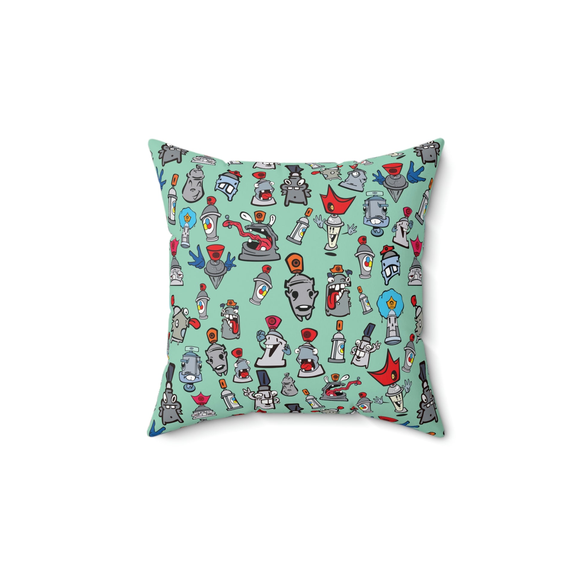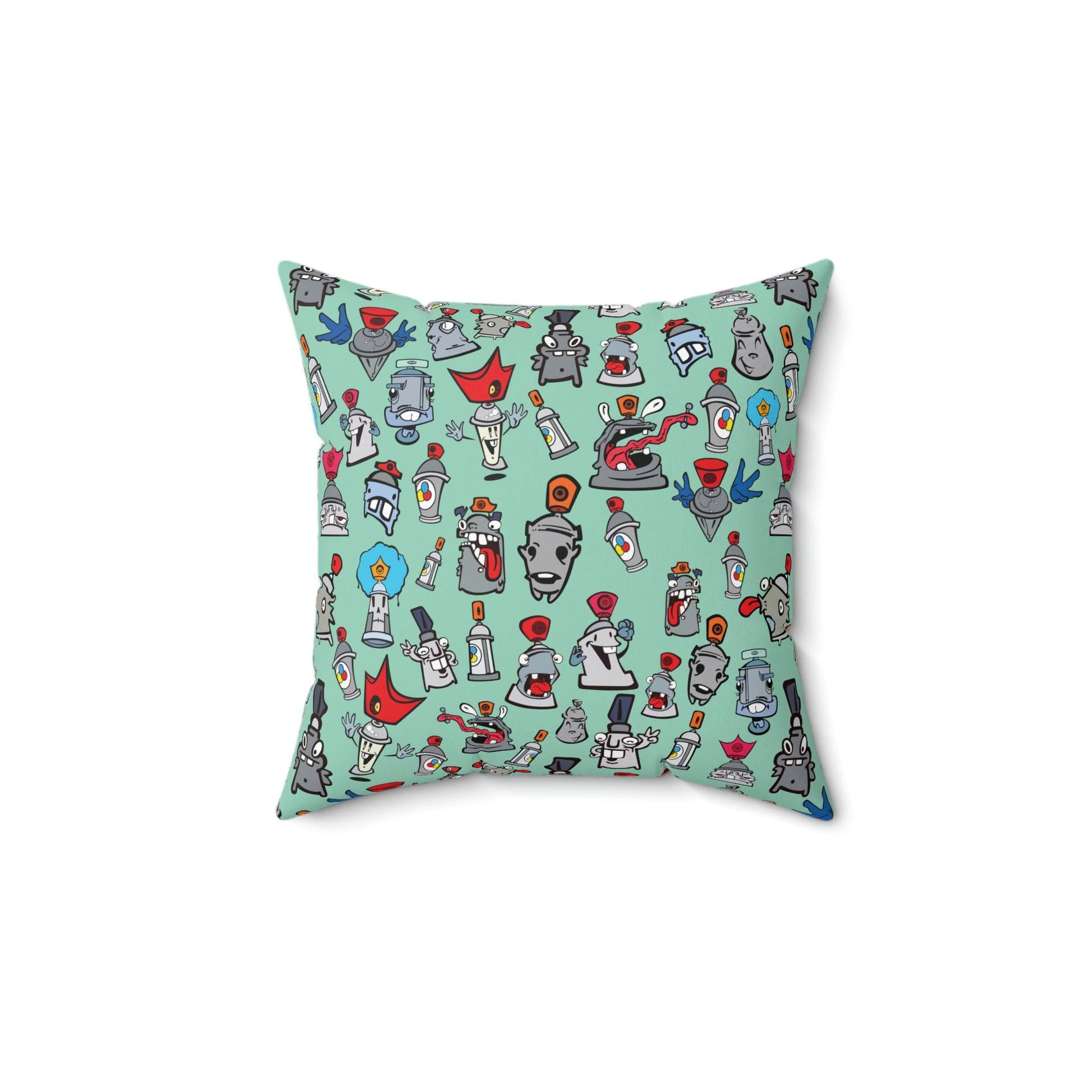 Spun Polyester Square Pillow - Graffiti Cartoon Characters in Teal Color